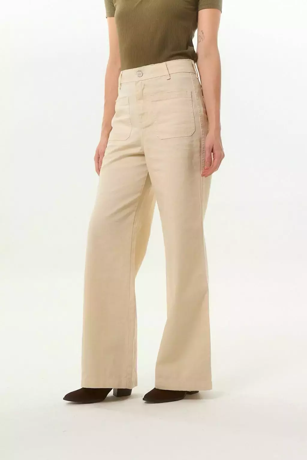 Jean wide leg full largo. tiro alto con dos bolsillos de plaque en la parte delantera y en la parte trasera. Cierre y botón. Tejido de algodón gabardina 100% rígido efecto esmerilado. 100% Algodón. Talles 24 26 28 30 32 34.